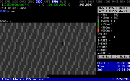 2、可正常分区,可格式化,但扫描发现有“B”标记的,也就是通常所说的“出坏道 ”。这里可不分“物理坏道”或“逻辑坏道”,“B”数量少的话(少于100个),基本上有80%可以修复为“好硬盘”。这种情况出需用一些通用的维修软件就可以解决。