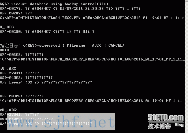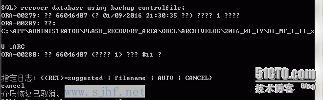 恢复数据库需要2016_01_19的11号归档日志。由于归档日志丢失,使用cancel参数进行不完全恢复。